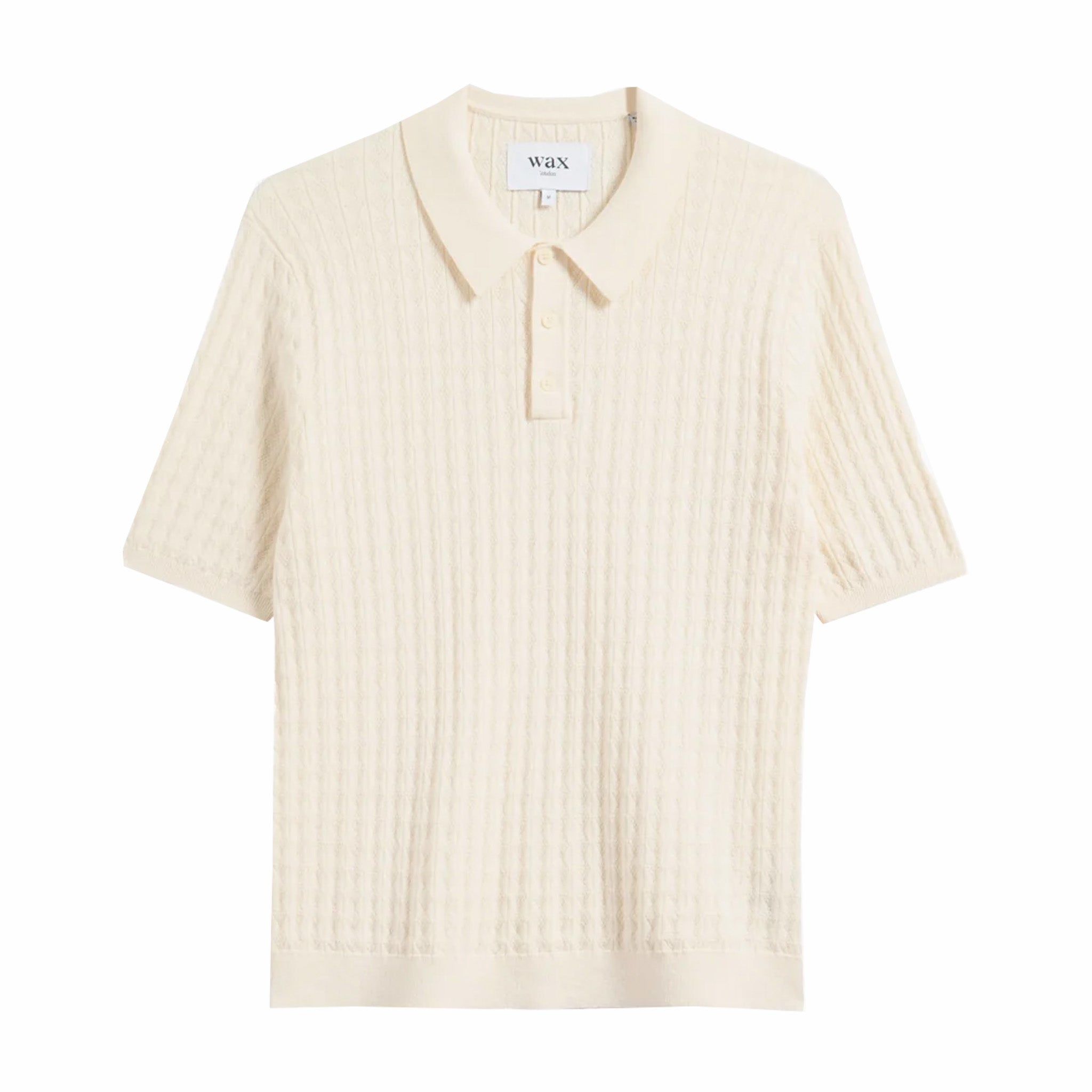 The Wax London Naples Polo - Diamond Stripe (Ecru) blends vintage charm with expert tailoring. Made from a lightweight, textured cotton blend, it showcases a delicate diamond stripe jacquard woven into the fabric for subtle depth. Its soft ecru shade offers a versatile, modern neutral that complements both casual denim and smart trousers. Designed with a regular fit, flat knit collar, and open placket, this polo reinterprets mid-century style with a fresh, eclectic twist—perfectly balanced for both laid-back days and stylish evenings.
